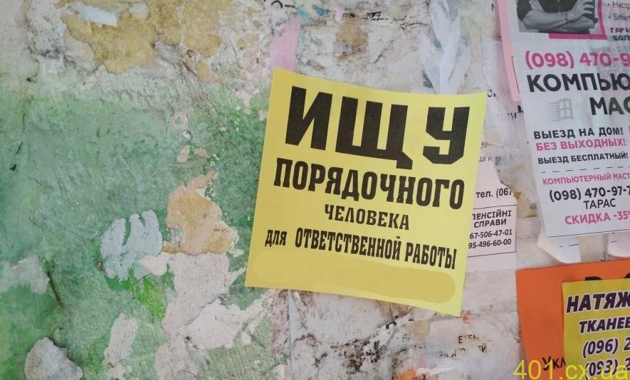 Это самая необычная вакансия, которую мы встретили. Размещена она не в интернете, а на некоторых подъездах Киева. Ищут «порядочного человека для ответственной работы». Для какой именно работы — остается загадкой, но, если вы вдруг решите поинтересоваться — не забудьте рассказать в комментариях.
